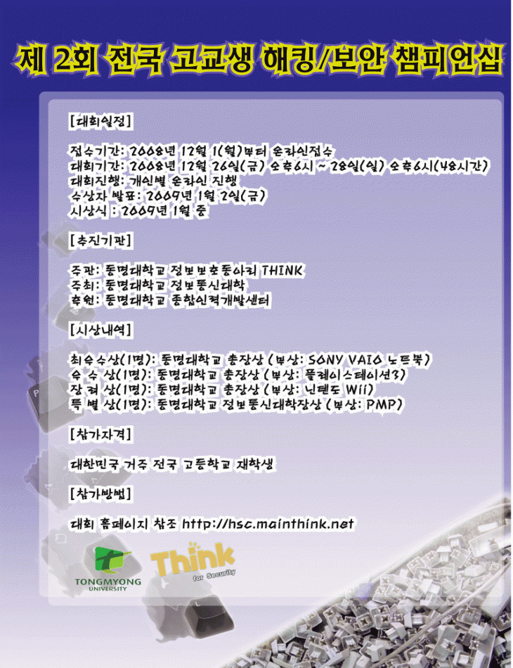 동명대학교에서 국가 정보보안의 미래라 할 수 있는 정보보호에 관심있는 청소년들에게, 해킹과 그 대응 기술에 대한 연마 기회를 제공하고, 정보보호에 대한 올바른 마인드 확산을 위하여「제 2회 전국 고교생 해킹/보안 챔피언십」을 개최합니다.