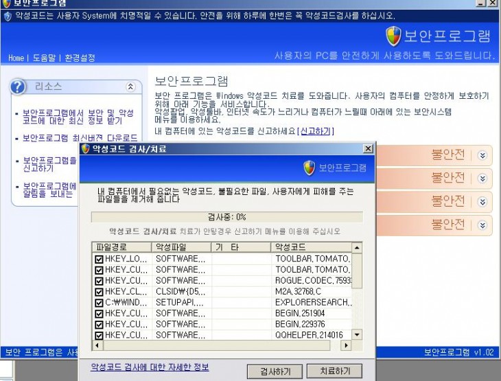 알약이나 PC그린을 2개 설치해서 해보세요 그 2개에서도 지금 것과 거의 동일하게 나온다면 진짜 감염된것이고 아니라면 저 프로그램이 수(?)를 쓴겁니다.