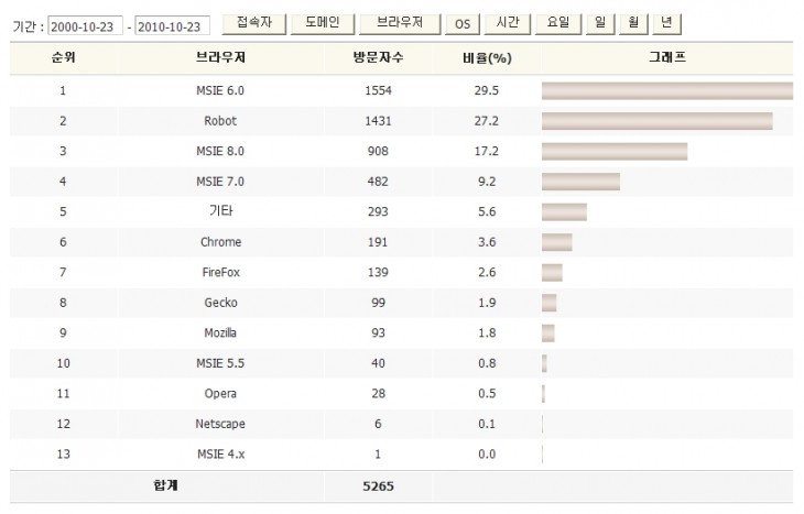 브라우저별 접속자현황.. IE6까지는 뭐 그렇다쳐도.. 다음이;;ㅜㅜ 정보 브라우저별 접속자현황.. IE6까지는 뭐 그렇다쳐도.. 다음이;;ㅜㅜ 바이탈 홈페이지 자기소개 아이디로 검색 회원게시물 홈페이지 자기소개 아이디로 검색 회원게시물 (110.♡.♡.139) 2010.10.23 22:19:34 조회 1,210 댓글 0 이전 게시글 다음 게시글 목록 글쓰기 본문 2000 ~ 2010 년 현재까지..IE6이 1등이지만 2등이.. 로봇이군요 슬퍼요!! 로봇들이나마 더 오게하는법 없을까요?ㅜ 추천 0 댓글 0개 이전 게시글 다음 게시글 목록