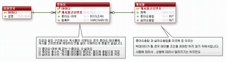회원이 좋아요를 누르면 좋아요 테이블에 회원아이디(혹은 고유번호), 게시물고유번호, 좋아요 여부(저는 좋아요만 쓰려구요.), 등록 IP 가 저장되면서,