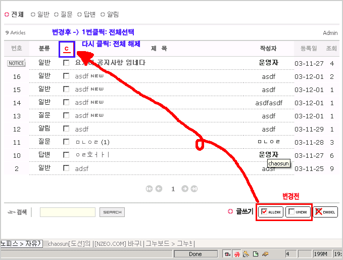그누보드 전체선택 해제 자바스크립트 질문본문