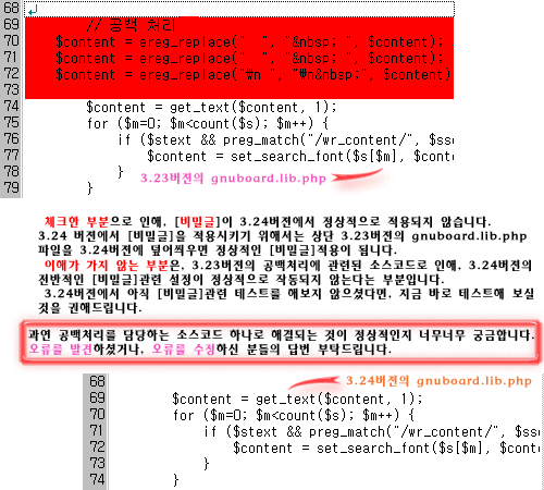 (상단에 기재하신 덧글중에, '공백처리'에 관련된 소스코드가 없는 하단의 이미지를 3.22버젼일것 같다고 하셨는데, 사실은 3.24버젼의 gnuboard.lib.php파일이 맞습니다.)