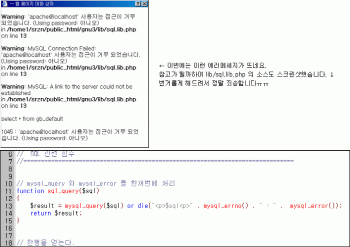 허민님, 아무래도 아닌 거 같습니다ㅡ.ㅡ;; 지금 에러가 나고 있는 파일은 본문에도 있듯이 gnu3/lib/sql.lib.php 거든요. 아.. 이거 포기해야 하는 건지...