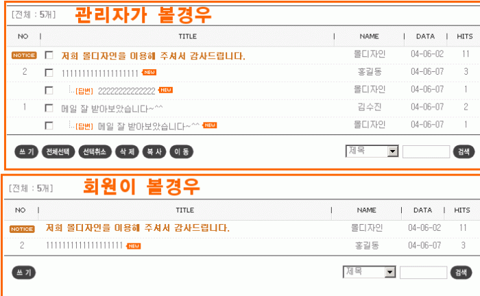 1. 관리자는 답변글이 다 보이는데 회원이 로그인 하면 자신의 글에 관리자의 답변이 안보입니다.
