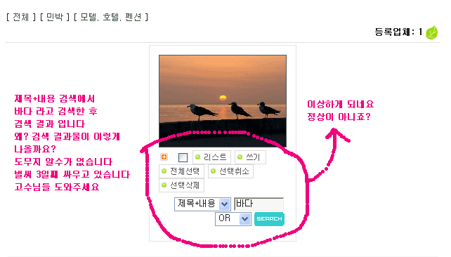 // 그리고 제목+내용 검색을 해보면 검색되어 나온 결과물이 이상하게 배열됩니다 이건 또 어떻게 된걸까요?