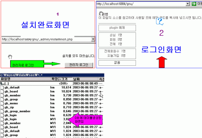 먼저 설치에서 모든걸입력하고 DB정보입력하고 확인하니 1번그림과 같이 설치가 완료 되엿다고 하드군요