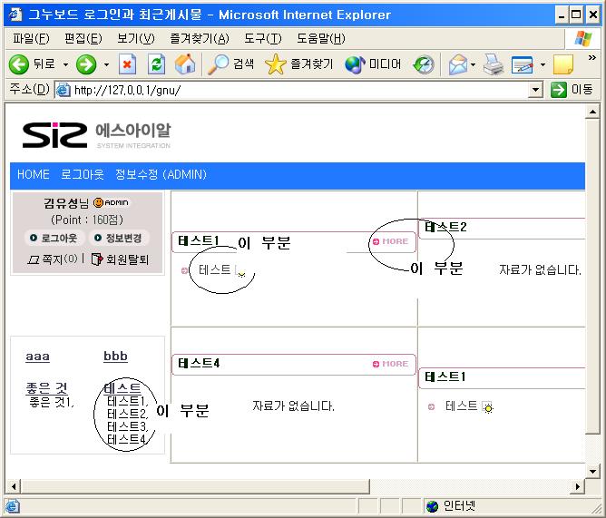 그림에서와 같이 표시한 부분(이 부분이라 해놓은 : 왼쪽의 목록, 게시판글제목, more)을 클릭하면 게시판목록이나 내용이 main.php가 들어가는 부분에 나오게끔 하고 싶습니다. html에서야 프래임에서 name 주고 target으로 설정해주면 되었는데 php에서는 어느 부분에 어떻게 수정해야하는지 도통 모르겠습니다. 어느 파일을 어떻게 고쳐야 되는지 가르쳐 주시면 감사하겠습니다.