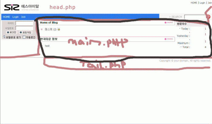 그리고, 게시판에 head와 tail붙이는 건 로그인한 게시판 수정화면에서 상단파일경로, 하단파일경로 에서 해줘야돼요.