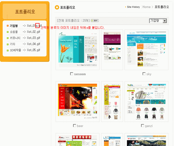 포트폴리오라는 갤러리 게시판에서 분류가 5가지가 있습니다.