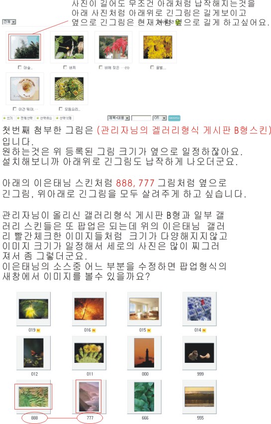 아래 소스들은 관리자님의 겔러리형식 게시판 B형 - (gallery_b폴더)스킨안의 gblist.skin.php 입니다. 어디를 수정하면 좋을까요?