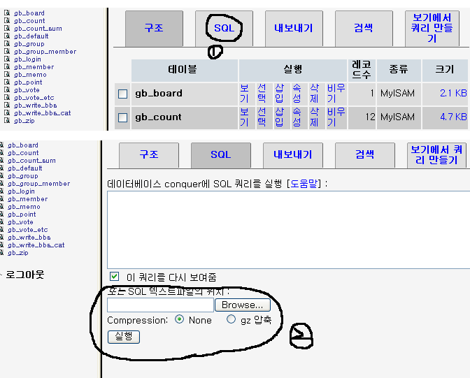 그래서 gb_board 테이블을 지우고 하니 이번엔 gb_count가 이미 존재한다고 나옵니다.