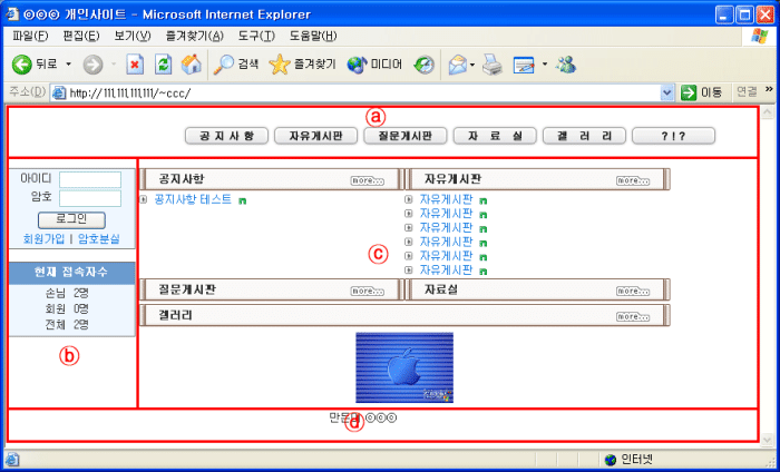 각 유저분들은 여러가지중 한가지를 선택할수 있도록 배려한다는 차원이조. 제방식이 쉽고 맘에 들수도 있고, ⓒⓒⓒ님 방식이 쉽고 맘에 드는분들도 계실테니까요. 현재 제작하고 있는 사이트가 어느정도 완성되고 나면 올리도록 하겠습니다.