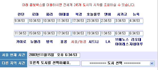 콤보박스를 이용하여 전세계 245개 도시의 시차를 조회하실 수 있습니다.
