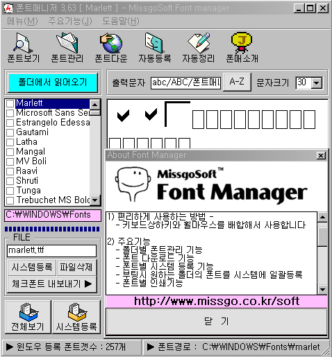 위 프로그램은 그래픽을 자주 사용하지 않는 유저라면 그렇게 쓰임새가 많지는 않을것 같습니다... 나스카님의 말씀대로 딜레이가 조금 있더군요..... 그래도 글꼴을 윈도우 폴더에 전부 카피해 넣었을때 보단 훨씬덜 하더군요..... ^^ 사용해 보실 분들은 참고 하세요....