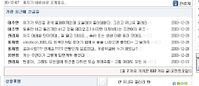 아래 부분의 최신글 목록이 산만하고 공간을 많이 차지해서 실제로 목록에 들어있는 내용이 무엇인지 알 수 없게 되어 있더라구요. 그걸 나타내려면 고려대학교 홈페이지의 index.html에 붙은 index.swf 같은 방식을 쓰거나 유니월드의 그 방식을 써야겠는데, 전자는 소스를 모르겠고..... 후자는 html 문서의 소스를 언듯 보기는 했는데, 전체 소스가 아니라 역시 모르겠고..... 끙끙거리는 중이랍니다.