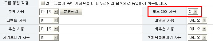 이젠 관리자 모드에 들어가 "보드 CSS 사용" 의 숫자 지정으로 그 css 를 사용하게 됩니다.