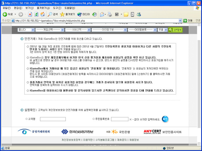 비 실명으로 판명이 날 경우 아이템거래 서비스를 이용하실 수 없으며, 반드시
