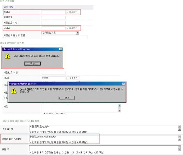 회원가입(중복아이디/닉네임,금지아이디/닉네임)체크, 관리자(금지아이디/닉네임등록) 정보