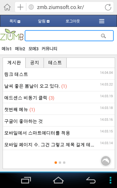 모바일 페이지로 강제(?) 접속하는 건 http://zmb.ziumsoft.co.kr/?platform=mobile 이렇게 뒤에 /?platform=mobile를 붙혀 넣으시면 됩니다. platform=pc 이건 반대로 PC화면으로 이동합니다.