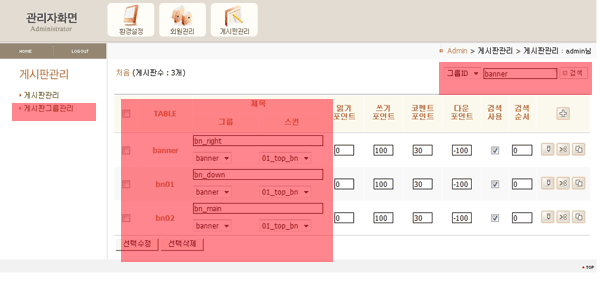 관리자 접속 후 그룹명 banner에 3개의 메뉴를 이용하셔서 배너를 올리시면 됩니다