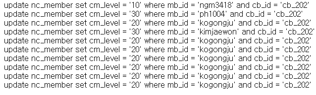 회원 등급 변경 오류 정보 회원 등급 변경 오류 해피정 홈페이지 자기소개 아이디로 검색 회원게시물 홈페이지 자기소개 아이디로 검색 회원게시물 2010.03.12 22:56:29 조회 1,192 댓글 0 이전 게시글 다음 게시글 검색목록 목록 본문 클럽관리에서 회원 변경클릭하면 아래와 같이 중복된 아이디가 반복적으로 나오고 있습니다. 위의 이미지는 echo 문으로 찍어본 결과입니다. 점검 부탁드립니다. 추천 0 댓글 전체 이전 게시글 다음 게시글 검색목록 목록