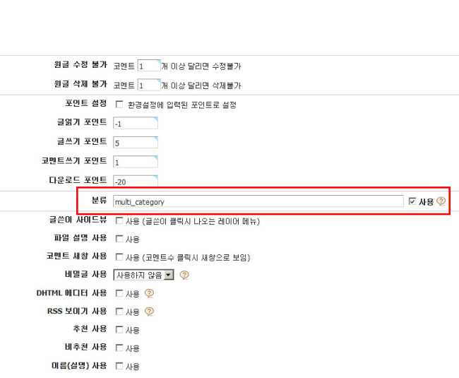 1. 게시판 관리자모드에서 기존 카테고리 설정을 하는 분류 에 multi_category 를 입력하고 사용을 체크한후 저장한다