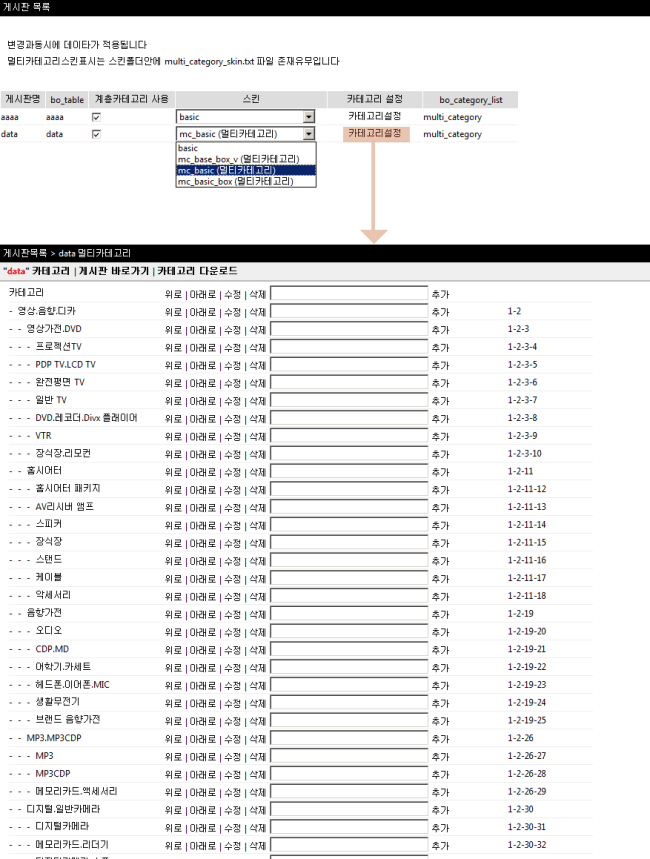 * 카테고리관리자에서의 작업은 게시판 테이블 데이타에 영향을 주지 않습니다