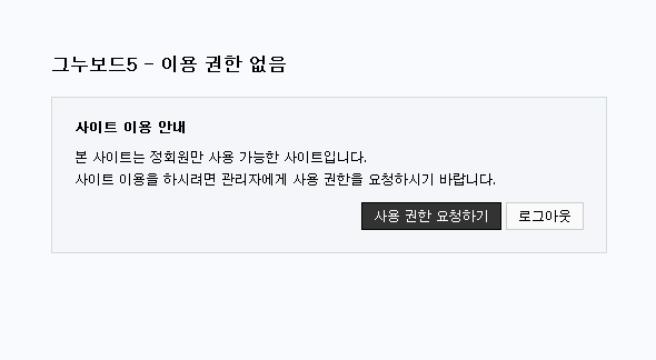 정회원 이상의 회원만 사이트에 접근하도록 설정합니다. 정회원은 플러그인 설정 페이지에서 설정한 회원 레벨 이상을 의미합니다. 회원가입 후 권한이 없는 사용자는 관리자에게 권한 요청을 할 수 있고, 관리자는 관리자 페이지에서 수락하여 사용자 레벨을 간단히 올릴 수 있습니다.