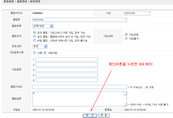[클럽관리]-[수정]-수정작업후 [확인]하니 아래와 같이 에러가 나옵니다.