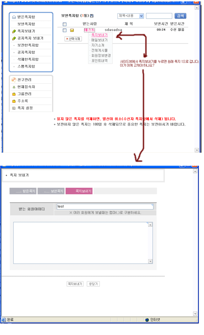 사이드뷰에서 쪽지보내기를 누르면 과거버전이 뜨는데요....