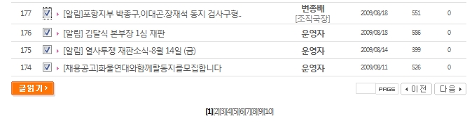 체크한 글 한꺼번에 읽는 기능 붙이는 플러그인(혹은 스킨) 있나요? 정보 체크한 글 한꺼번에 읽는 기능 붙이는 플러그인(혹은 스킨) 있나요? Mytory 자기소개 아이디로 검색 회원게시물 자기소개 아이디로 검색 회원게시물 2009.11.14 00:49:46 조회 656 댓글 0 관련링크 http://www.unsunozo.org/mboard.asp?strBoardID=content02_02 966회 연결 이전 게시글 다음 게시글 목록 본문 위 그림처럼 4개를 체크한 다음 '글읽기' 버튼을 누르면 글 네 개가 동시에 나옵니다.http://www.unsunozo.org/mboard.asp?strBoardID=content02_02위 링크로 가 보시면 볼 수 있습니다.그누보드에서 구현된 플러그인이나 스킨 같은 게 있을까요? 댓글 전체 이전 게시글 다음 게시글 목록