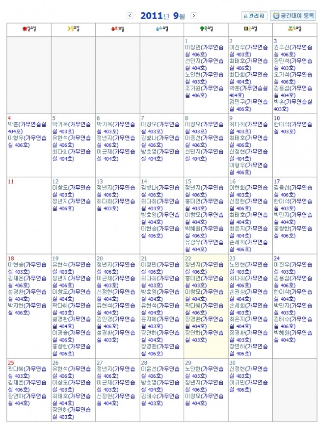 달력으로 나와있구요, 공간대여 신청을 하면 달력에 누가 등록을 했는지 나오게 됩니다.
