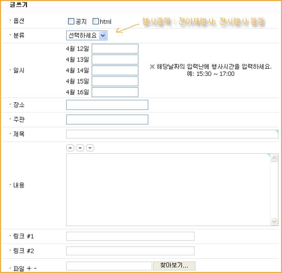 wr_1 ~ wr_10의 필드를 다 사용할 수 있게 했습니다. 이 스킨에서는 현재 wr_2 ~ wr_6, wr_9, wr_10을 썼는데 경우에 따라서는 더 쓸 수도 있습니다. 참고로 wr_2 ~ wr_6은 각 날짜별 행사시간, wr_9는 장소, wr_10은 주관용으로 썼습니다.