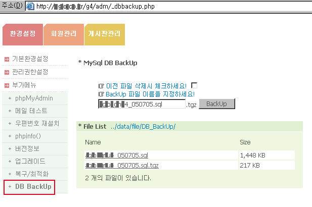 관리자 메뉴에서 환경설정 > 부가메뉴 > DB BackUp 메뉴로 추가하였습니다.