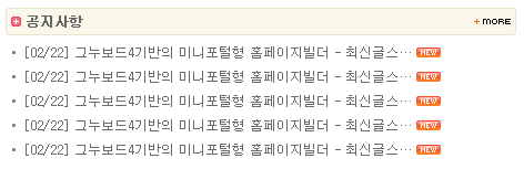 예) <?=latest("emp_basic1_01", "notice", 5, 20);?>