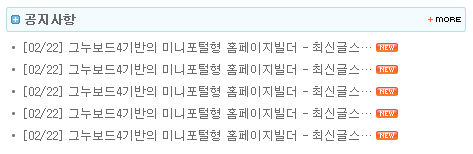 예) <?=latest("emp_basic1_02", "notice", 5, 20);?>