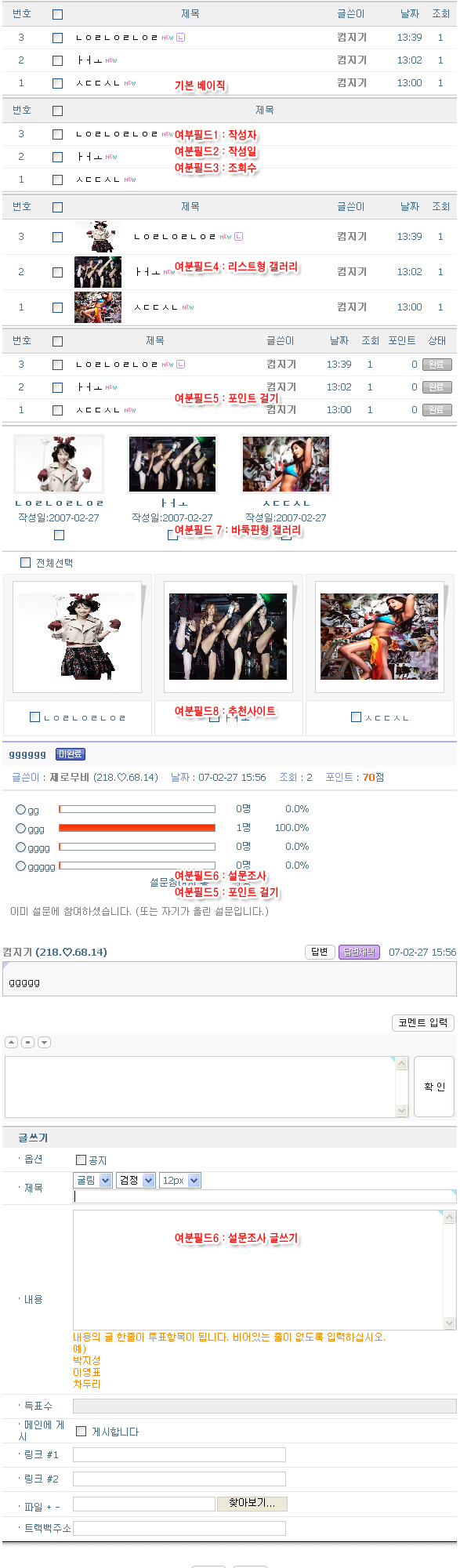 하우로드// 님 글처럼 글쓴이, 조회수, 작성일, 포인트, 성인글 옵션 등의 기본 기능은 게시판 관리자 모드에서 쉽게 기능을 설정할 수 있게 다음 그누 버전에 추가되었으면 좋겠습니다.
