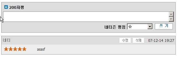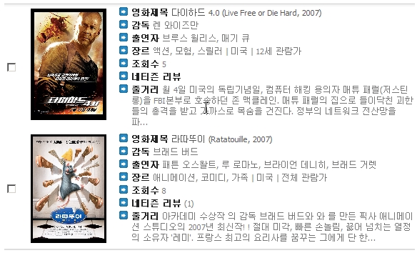 sir 게시판 ntype 게시판을 영화 게시판으로 수정 해 보았습니다. 그냥 한것도 없이 몇가지 추가만 했을 뿐입니다. 코멘트에 평점 부분도 추가 해 봤습니다. 그냥 허접한 게시판 하나 만들었어용... 게시판 생성 하실때 dhtml 사용 하지 마세요. 사용하고 글 쓰면 태그들이 보인다는 왜 그런지는 모르겟네요. 기존 basic 스킨의 내용 쓰는 부분하고 ntype 쓰는 부분하고 좀 달라서 그런 것 같은데 별 지장은 없담니다. 이 부분 고쳐서 쓰실분은 지에디터 설치 한번 해보시면 고쳐 질것 도 같구요.. 아닐수도 있구요..^^ 해보실 분은 해보시구요. 그냥 사용하셔도 괜찮다는...