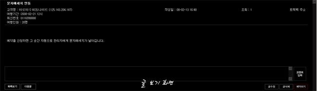 6. 예약처리는 답변글이 아닌 관리자로 로그인 하신 후에 코멘트입력만 하시면 자동으로 예약완료처리됩니다.