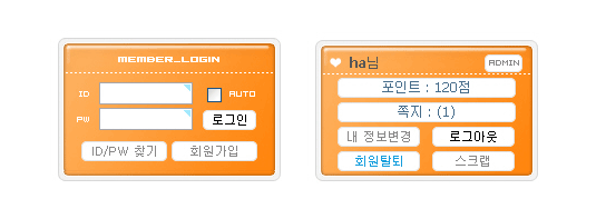 오렌지색 아웃로그인입니다...(회원탈퇴 버튼이 들어있습니다.) 정보