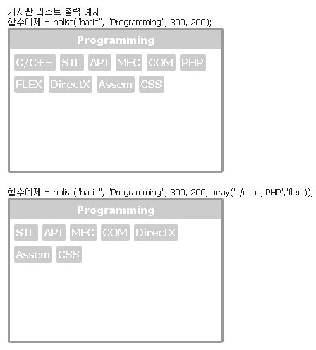 함수예제 = bolist("basic", "Programming", 300, 200, array('c/c++','PHP','flex'));