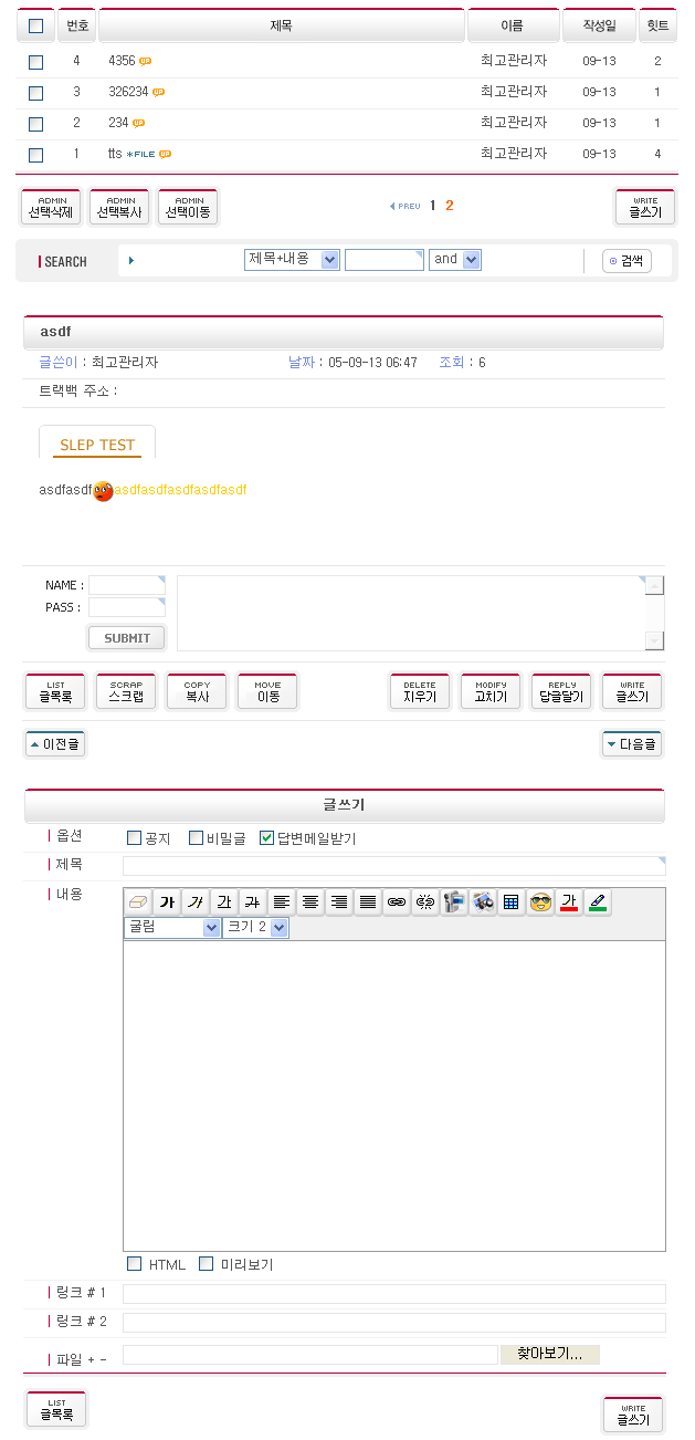앙앙..근데요.. 제가홈에 적용하니까 글쓰기게시판은 기본환경으로 나와요..ㅠ.ㅠ