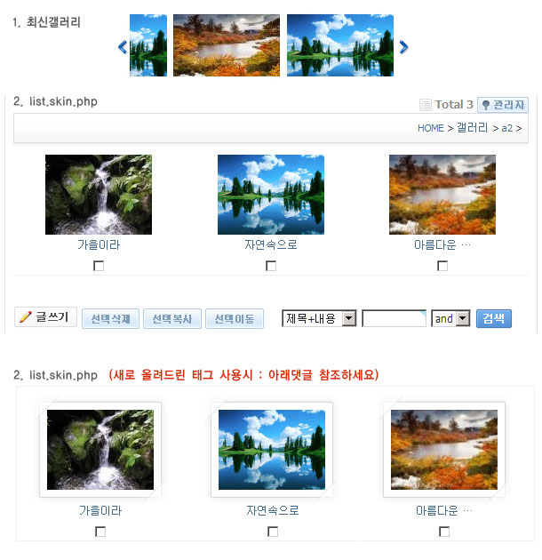 --- list.skin.php (새로 올려드린 태그 활용시) 모양처럼 됩니다.