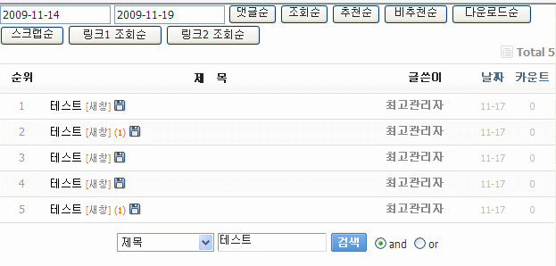 댓글순은 홈페이지내에 검색허용 게시판중 몇백건의 댓글이 달린게시물들이 존재하는데, 출력되는것은 댓글이 안달린 게시물들이 순위권에 들어오고있네요.