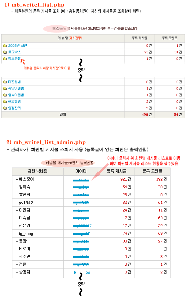 회원별 게시물/코멘트 등록현황 출력하기관련링크