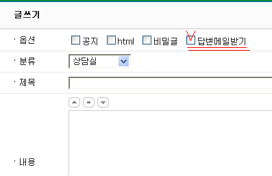 각 게시판의 글쓰기 화면(write.skin.php)에는 이메일발송에 체크되어 출력됨.