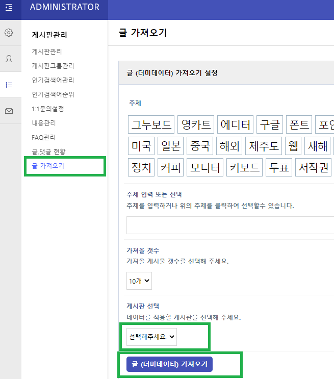 사용방법은 관리자 -> 게시판관리 -> 글 가져오기 메뉴에 들어가서