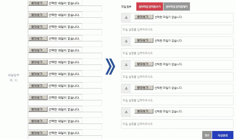 그누보드4 에서와 같이 파일 입력폼 추가/제거 버튼을 두어 누르면 설정된 갯수까지 늘어날수 있도록 처리하였습니다.