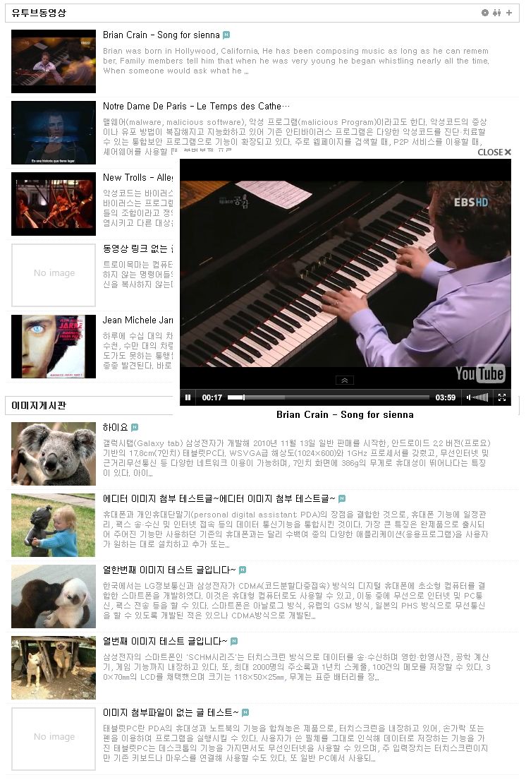 참고로 '링크1'에 'youtube'란 단어가 포함된 주소가 연결되지 않을 경우 첨부파일이 있으면 첨부파일을 썸네일로 출력하므로 뉴스형태의 최신글로도 활용 가능합니다.