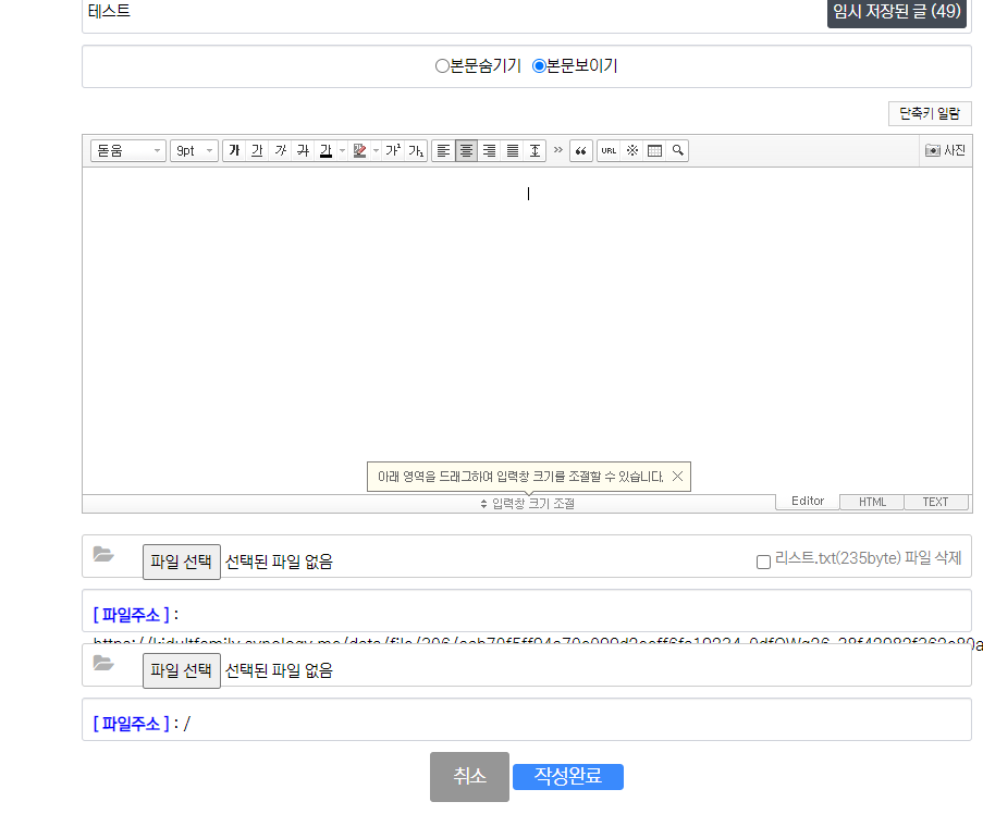 늘 하는대로 mp4 소스와 영상설명을 게시판 글쓰기에 붙여넣기 하니까 계속 안되어서 설명을 다시보니까 mp4 소스와 영상설명을 그림처럼 메모장과 같은 텍스트로 작성하여 그 파일을 글쓰기에서 첨부파일로 올리는 것이네요.